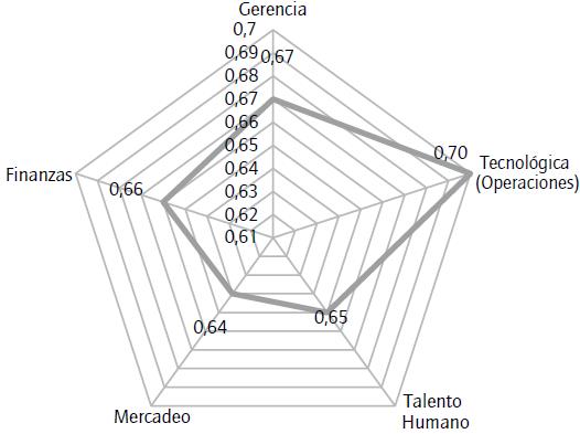 Finalmente, todas las áreas funcionales son importantes dentro de una empresa, porque se interrelacionan. Sin embargo, de acuerdo con los resultados arrojados, en su orden se deben atender prioritariamente fortalezas de las siguientes áreas (gráfica 1): 1) área de mercadeo, 2) área de talento humano y 3) área de finanzas.