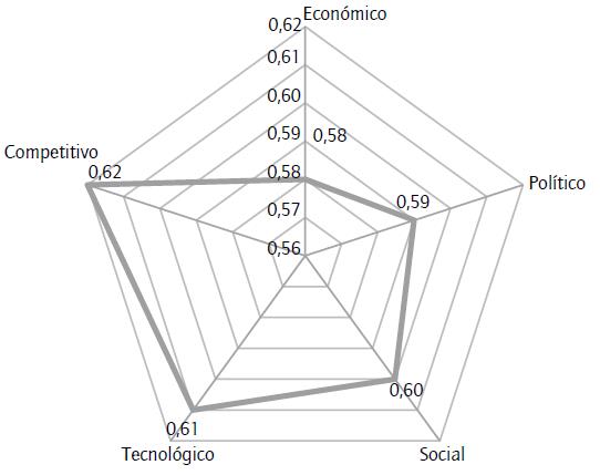 Para evaluar el análisis externo (Prieto-Herrera, 2012), se evalúan oportunidades y amenazas respecto al medio donde se desenvuelven, desde la perspectiva de los directivos. Dentro de este análisis, se tienen presentes los siguientes factores: el económico, el político, el social, el competitivo y el tecnológico.