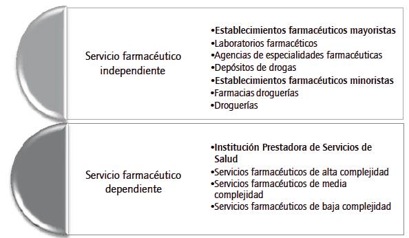 Según las formas de prestación del servicio farmacéutico, este podrá ser prestado de manera dependiente o independiente (figura 1). El servicio farmacéutico, prestado por una Institución Prestadora de Servicios de Salud (IPS) a pacientes hospitalizados y ambulatorios, se le conoce como servicio farmacéutico dependiente, y este puede ser propio o contratado. Por otro lado, está el servicio farmacéutico independiente, que prestan los establecimientos farmacéuticos autorizados y comprende los establecimientos farmacéuticos mayoristas y los establecimientos farmacéuticos minoristas, según la Resolución 1.403 del 2007. Asimismo, su funcionamiento y operatividad se observa no solo a nivel nacional sino también desde el ámbito local.