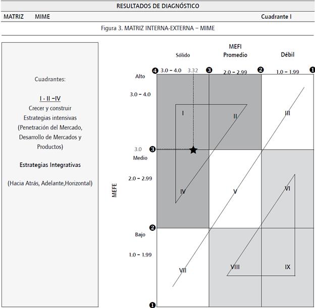 Del mismo modo, es necesario elaborar la MEFI, pues a través de este instrumento se resume y evalúa los factores internos clave (las fortalezas y debilidades más importantes) con base en las áreas funcionales de las empresas, así como la relación entre estas áreas (Gallardo-Hernández, 2012). Sin importar cuántos factores estén incluidos en esta matriz, su resultado total ponderado puede oscilar de un resultado bajo (1,0) a otro alto (4,0), siendo el resultado promedio 2,5. Los resultados mayores de 2,5 indican una empresa poseedora de una fuerte posición interna, mientras que los resultados menores a 2,5 demuestran una organización con debilidades fuertes (Prieto-Herrera, 2012; Rodríguez-Valencia, 2013). Como ya se adelantó, una vez elaboradas la MEFE y la MEFI, se aborda la MIME, que cruza la información de las matrices anteriores, con el fin de obtener la posición estratégica recomendada.