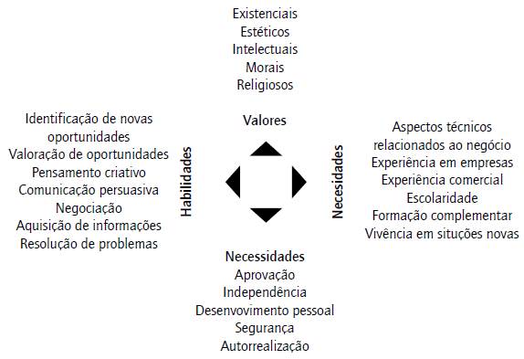 Santos (2008) estabeleceu um modelo de avaliação do potencial empreendedor, apresentando um quadro referencial com um conjunto das características do comportamento empreendedor (figura 1), que envolvem: valores, habilidades, necessidades e conhecimentos.