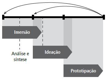 O design thinking consiste em um processo baseado em três etapas, com metodologias e ferramentas que estimulam a criatividade e a inovação que são utilizadas em cada uma das etapas (figura 2): (i) imersão - que busca a identificação do problema a ser resolvido, informações sobre, clientes, produtos, mercados e concorrentes; (ii) ideação - que consiste no uso de métodos e técnicas de geração de ideias; (iii) prototipação - para a prototipagem da ideia de negócios em várias etapas do processo, permitindo fluxos circulares de análise e síntese da ideia de negócios.