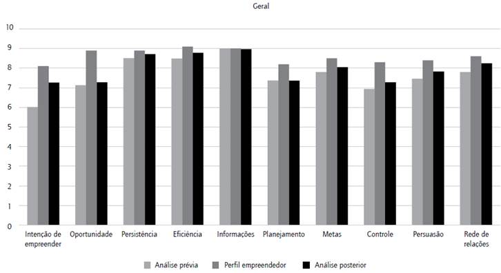 Na análise sistêmica dos dados, pode-se inferir que não se trata de entender o processo de ensino e aprendizagem como falho, mas de se perceber que o aluno mais consciente do que seja uma oportunidade de negócio somente empreende quando percebe na oportunidade algo realizável com sucesso. Isso pode ser reforçado ainda por outra variável que demonstrou variação das médias, que envolve os aspectos de controle do negócio, no caso dos alunos de Gestão Comercial ( 6,7 anterior e 7,5 posterior) e Comércio Exterior (5,9 anterior e 6,4 posterior), sendo 8,3 a média da escala do modelo de potencial empreendedor. O controle envolve a capacidade de liderar os processos organizacionais, gerenciando equipes e delegando responsabilidades; motivando e direcionando seus liderados para o sucesso, planejando ações, estabelecendo metas, persuadindo sua equipe para o sucesso.
