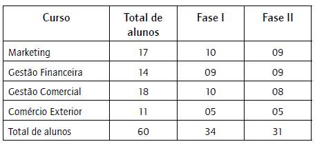 A coleta de dados se deu em dois momentos distintos, no início do processo de ensino e aprendizagem, quando foram entrevistados 34 alunos ingressantes nos quatro cursos analisados. Ao final do processo, os alunos foram entrevistados novamente, um total de 31 alunos, sendo que dois alunos que iniciaram o processo desistiram de seus cursos, por problemas alheios a esta pesquisa, conforme indicados na tabela 2.