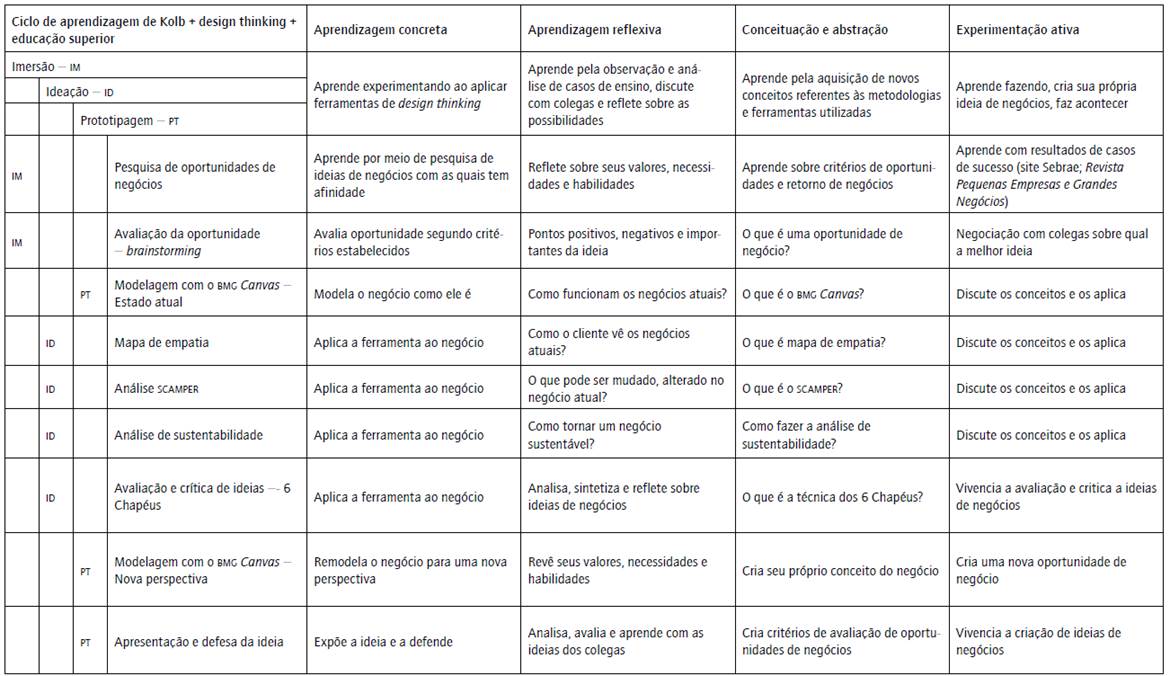 O design thinking, por sua característica processual, implica fluxos circulares de análise e sínteses de resultados, utilizando-se em cada etapa do processo (imersão, ideação, prototipação) de ferramentas que sejam poten-cializadoras dessas etapas. Para efeito do processo de aprendizagem vivencial, cada etapa do processo deve contemplar a aprendizagem concreta, a reflexão, a abstração e a experimentação ativa. Construindo-se uma matriz a partir destas duas perspectivas, as etapas do processo de design thinking (Vianna et al., 2012) e o ciclo de aprendizagem experiencial (Kolb, 1984), torna-se possível realizar atividades de ensino e aprendizagem integradas em termos de processos, métodos e técnicas que permitam ativar no aluno o potencial empreendedor proposto por Santos (2008); dessa forma, verifica-se a integração entre a teoria e a prática em atividades vivenciais.l