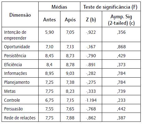 Após as análises, com a amostra de 60 pessoas, foi realizado o teste de significância (F) das médias, para todas as dez dimensões de Santos (2008). A análise estatística realizada indica um valor p>,005 e não indica a existência de médias estaticamente significativas, mesmo que as médias finais tenham sido maiores que as médias inciais as quais evidenciam o potencial empreendedor em cada um dos cursos analisados. Na tabela 3, apresentam-se os principais resultados.