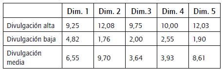 Con el objetivo de clasificar los ayuntamientos en función de las semejanzas y diferencias con respecto a los niveles de divulgación sobre emprendimiento, se ha aplicado un análisis clúster (Pardo-Merino & Ruiz-Díaz, 2005; Vilá et al., 2014). Una vez comprobado que entre las variables que vamos a utilizar para llevar a cabo la agrupación (los índices de cada dimensión) no existe multicolinealidad, se ha aplicado el método jerárquico y se han identificado tres clústeres, que hemos denominado divulgación alta, divulgación media y divulgación baja. Adicionalmente, para comprobar que existen diferencias significativas entre los conglomerados obtenidos, se lleva a cabo un análisis de la varianza (Anova). Podemos observar en la tabla 3 que las probabilidades asociadas al estadístico "F" son cero para las cinco dimensiones, por lo que confirmamos que existen diferencias estadísticas entre los grupos.