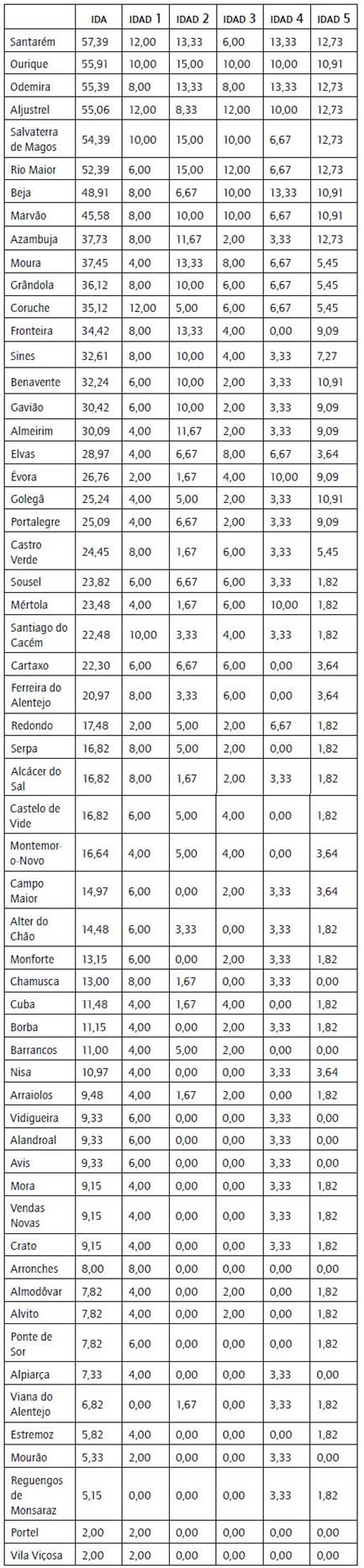 Con base en los índices individuales de cada entidad (IDA), en el anexo 1 se presenta el ranking de los municipios con respecto al nivel de información divulgada. Como se puede comprobar, el ayuntamiento de Santarém encabeza el ranking con un índice del 57,39%, seguido de Ourique (55,91), Odemira (55,39%), Aljustrel (55,06), Salvaterra de Magos (54,39%) y Rio Maior (52,39%). Las últimas posiciones las ocupan las localidades de Estremoz, con un índice de divulgación del 5,82%, Mourao (5,33%), Reguengos de Monsaraz (5,15%), Portel y Vila Viçosa, con un índice del 2% cada uno de ellos. Asimismo, puede apreciarse que solo seis ayuntamientos (Santarém, Ourique, Odemira, Aljustrel, Salvaterra de Mago y Rio Maior) divulgan más del 50% de los indicadores propuestos, si bien otros están muy próximos como Beja y Marvao, con unos índices del 48,91 y 45,58%, respectivamente.