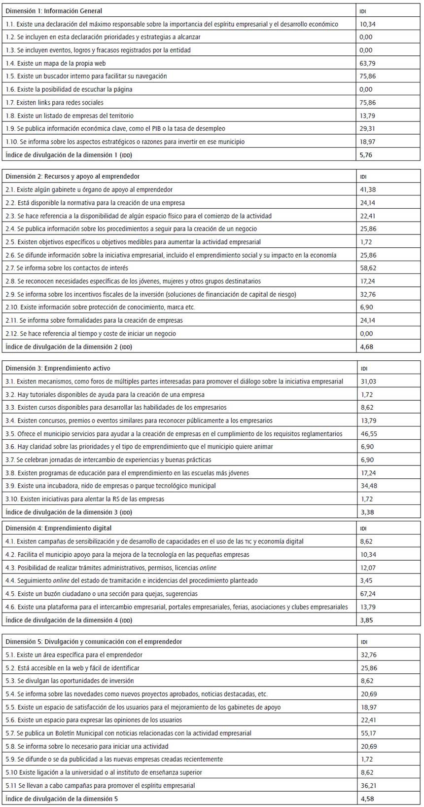 El resultado fue la creación de un cuadro de 49 indicadores que se dividió en cinco dimensiones (anexo 2): 1) información general (10 ítems); 2) información sobre recursos y apoyo al emprendedor (12 ítems); 3) información sobre emprendimiento activo (10 ítems); 4) información sobre emprendimiento digital (6 ítems), y 5) información sobre divulgación y comunicación con el emprendedor (11 ítems). El criterio empleado para puntuar el nivel de divulgación ha sido asignar a cada indicador el valor 1, en el caso en que la entidad haya divulgado la información, y 0, en el caso de que no exista información para ese ítem. Este criterio ha sido empleado en numerosos trabajos de investigación como los de Rodríguez, Caba y López (2006, 2007), Bastida y Benito (2007), Pina, Torres y Acerete (2007), Navarro et al. (2010) y Nevado et al. (2013), entre otros. Posteriormente, para realizar el análisis descriptivo, se procedió a la elaboración de los siguientes índices:
