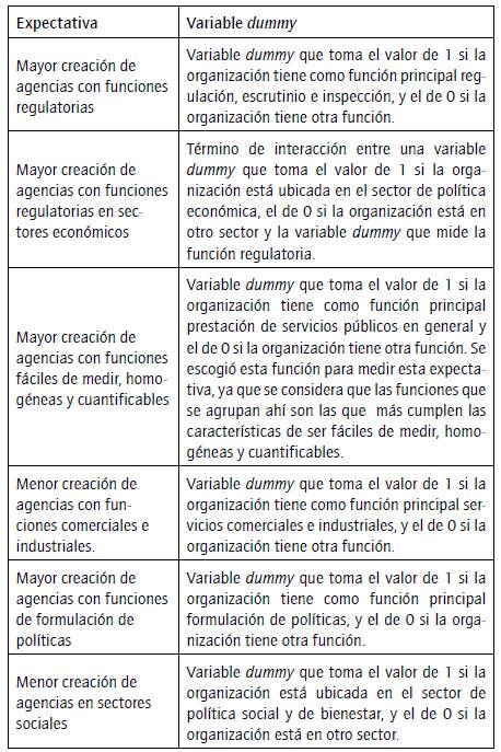 Para poner a prueba las expectativas presentadas en la tabla 1, se creó una serie de variables dummy que capturaban las diferentes funciones y sectores de política pública que se cree que tienen un efecto en la creación de agencias. La tabla 2 presenta una relación entre las expectativas propuestas y su operacionalización.