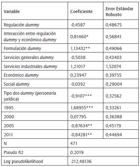 Sin embargo, los resultados del modelo también muestran que las funciones regulatorias en general y estar en sectores de política económica no son determinantes para explicar la creación de agencias. Esto quiere decir que solo hubo una tendencia para crear agencias con funciones regulatorias en sectores económicos, no en otros sectores.