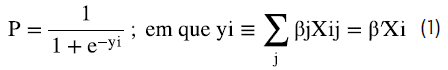 em que P indica a probabilidade de ocorrência do evento pela aplicação das variáveis explicativas e seus respetivos coeficientes βί.