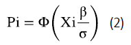 em que Φ corresponde à função da distribuição acumulada da distribuição normal, β ao vetor de coeficientes estimados da função, e Xi à matriz (n,k), em que n representa o número de observações e k os atributos característicos dessas observações. Assim como no modelo logit, a probabilidade probit está compreendida no intervalo de [0;1].
