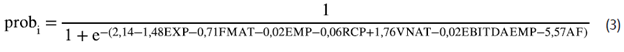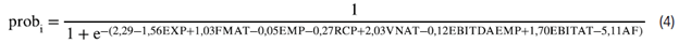Considerando a estimativa logit para um ano antes da falência, pela utilização do modelo v, pode-se definir a seguinte expressão (equação 4).