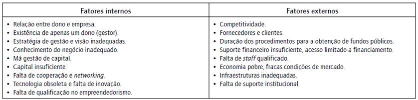 São vários os fatores identificados na literatura como favoráveis à falência de pme. Ropega (2011), Ihua (2009) e Franco e Haase (2009) identificam a existência de fatores internos e externos, ou seja, fatores resultantes de práticas internas da empresa e fatores externos não controláveis.