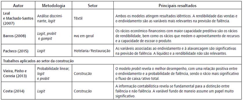 Beaver (1966) foi pioneiro na temática da previsão de insolvência das empresas. A partir do trabalho realizado por ele, foram vários os trabalhos e modelos que se foram desenvolvendo no âmbito da temática. Entre muitos outros, destacam-se os trabalhos seminais desenvolvidos por Altman (1968) e Altman, Haldeman e Narayanan (1977), no domínio da análise multivariada, e os trabalhos de Ohlson (1980) e Zmijewski (1984) no campo da análise de probabilidade condicionada.