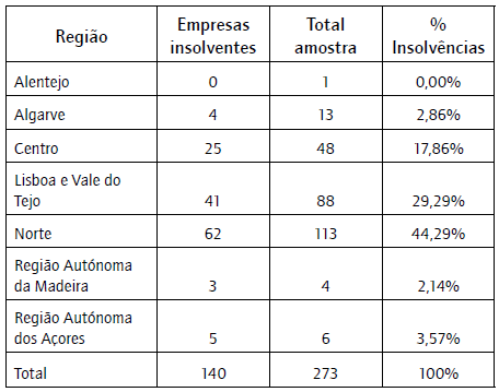 Pela análise à tabela 2, pode-se verificar que, das 273 empresas da amostra, se destacam três regiões com forte número de insolvências, nomeadamente as regiões Norte (44,29%), Lisboa e Vale do Tejo (29,29%) e Centro (17,86%). Como seria espectável, estes valores encontram-se de acordo com o número de empresas distribuídas por região da amostra, ou seja, as regiões com maior número de empresas analisadas são precisamente aquelas onde se regista uma maior incidência de insolvências.
