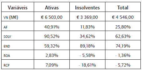 Através da análise à tabela 3, verifica-se que as empresas ativas da amostra, comparativamente às empresas insolventes, dispõem de valores médios bastante superiores em termos de volume de negócios, autonomia financeira, solvabilidade, rendibilidade do ativo e rendibilidade do capital próprio. Verifica-se também que as empresas insolventes, em média, possuem um grau de endividamento superior a 100%, associado a uma autonomia financeira de 5,70%, o que indica uma forte instabilidade financeira e incapacidade de autofinanciamento. Denota-se, portanto, uma clara distinção entre os valores apresentados pelas empresas ativas em face dos apresentados pelas insolventes. Relativamente às empresas ativas, constata-se que os dados correspondentes à amostra se encontram sensivelmente em linha com os dados globais do setor, apresentados na tabela 1.