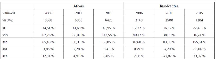 A tabela 4 apresenta uma análise aos mesmos dados financeiros referidos na tabela 3, no entanto apresentados numa disposição que permite compreender a evolução das empresas da amostra ao longo do período considerado. São apresentados dados para um ano antes do eclodir da crise económicofinanceira (2006), para um ano intermédio (2011) e para o último ano do período analisado (2015), o qual representa a situação mais atual possível, situação essa que será de recuperação para as empresas ativas e degradação para as empresas insolventes.