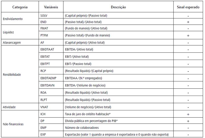 De modo a constatar quais os principais fatores que induzem à falência de uma empresa (variáveis independentes) no setor da construção, selecionaram-se diversas variáveis explicativas do acontecimento. Estas variáveis traduzem-se essencialmente em rácios financeiros distribuídos nas categorias de endividamento, de liquidez, de alavancagem, de rendibilidade e de atividade. Estes rácios foram essencialmente selecionados com base na significância que apresentaram noutros estudos, assim como pela disponibilidade de dados existente. Apesar de serem os rácios financeiros que desempenham papéis representativos nos estudos anteriores, serão também testadas algumas variáveis não financeiras, o que constitui um aspeto inovador do presente artigo. As variáveis selecionadas e os sinais esperados para a relação destas com a falência de empresas do setor são apresentadas no quadro 3.