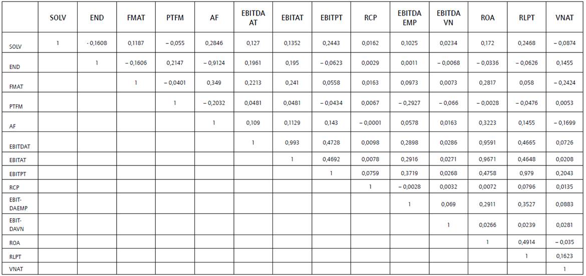 De modo a detetar a ocorrência de problemas de multico-lineariedade, foi realizado um cálculo de correlações entre as variáveis. Pela análise da matriz de correlações (tabela 5), verifica-se que os rácios que apresentam maior correlação entre eles são os rácios de autonomia financeira e do endividamento (correlação negativa), os rácios EBITAT e EBITDAT (correlação positiva), os rácios de rendibilidade do ativo e EBITDAT (correlação positiva), os rácios de rendibilidade do ativo e EBITAT (correlação positiva) e os rácios RLPT e EBITPT (correlação positiva); portanto, será evitada a utilização conjunta destas variáveis nas regressões a efetuar.