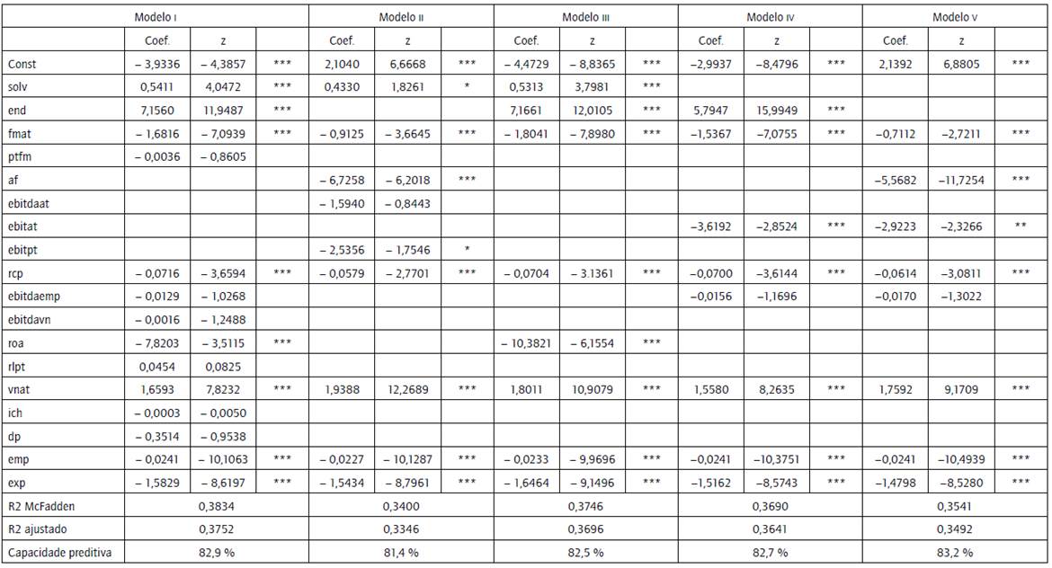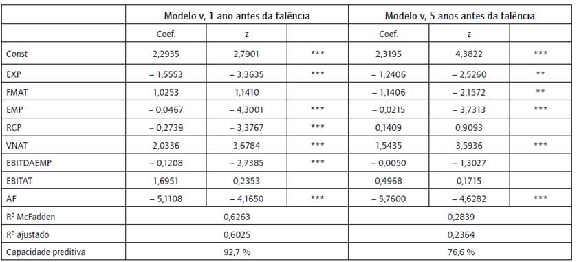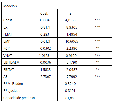A tabela 6 evidencia que os vários modelos testados se revelaram estatisticamente significativos na previsão de falência, no entanto o modelo v é aquele que exibe uma maior percentagem de sucesso previsional. Refira-se que, apesar de não serem apresentados esses valores, nas diferentes estimações, as variáveis apresentam fatores de inflacionamento da variância (VIF) inferiores a 2, o que denota a ausência de problemas de multicolineariedade.