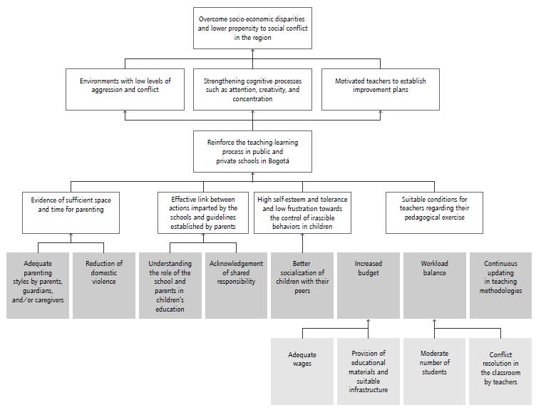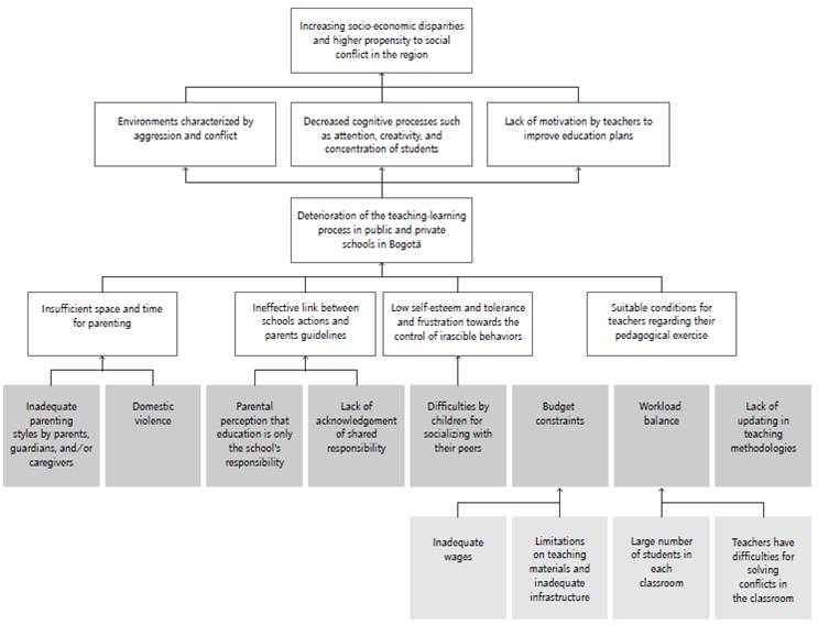 In order to build the problem tree (figure 1), the selection of a mean problem derivative of the more analysis is required. In this case, it is essential to understand the diagnosis of school education in Bogota to identify the problem. This diagnosis was built with information of the experiences of different schools teachers and took into account other stakeholders perceptions. After this analysis we could establish that the main problem is the deterioration of the teaching and learning process in public and private schools in Bogotá. The diagnosis and the knowledge of the authors allows for the identification of a cause-effect rationale, where the roots of the problem tree are the causes and its branches represent the effects of the main problem.