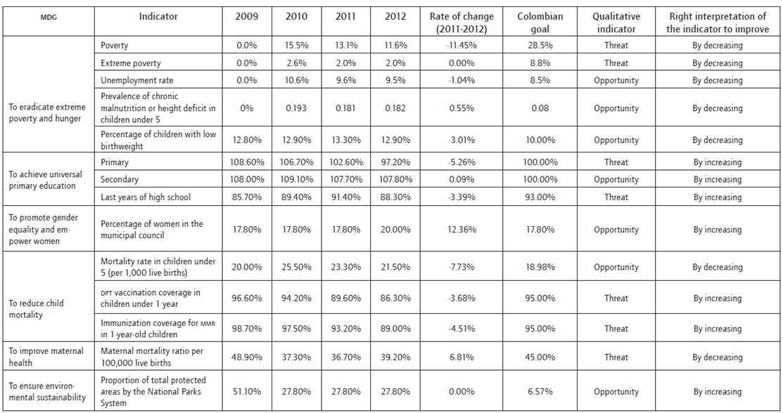 In the first stage, it was important to identify the region in which this methodology would be implemented. In our case, we decided on Bogotá given that its main campus is located in this city, and therefore its financial and operational center. In order to build the MORE we used a selection of representative MDCS and collected them for Bogotá, in an effort to understand the trend for each goal. We collected data for the period 2009-2012 taking into account information availability. However, we assume that this limitation does not affect the present analysis, because the trend of these indicators does not abruptly change in short periods of time. We have not used the new sustainable development goals (SDCS) given that their calculation and presentation still not available. As it is recommended, we also used Global Reporting Initiative (CRI) indicators to understand the performance of the University's CSR practices. Table 1 and table 2 show MDC and CRI information.
