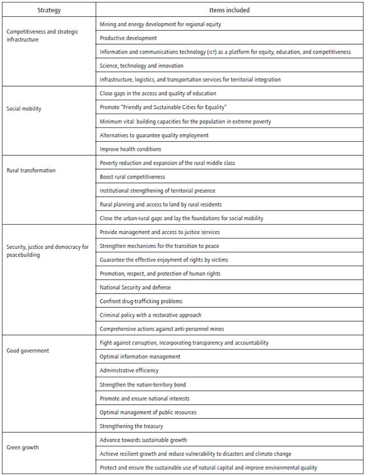In the intermediate levels the first criterion is to generate development for the company, which is divided into: being in accordance with the core business and the generation of company value. The alignment with the National Development Plan (NDP) and with each of its strategic areas is the second criterion. Santos administration NDP, called "Everyone for a New Country", included six strategic guidelines: (i) Competitiveness and Strategic Infrastructure; (ii) Social Mobility; (iii) Transformation of the Countryside; (iv) Security, Justice and Democracy for Peacebuilding; (v) Good Governance; and (vi) Green Growth. To understand the scope of each area, table 3 summarizes their elements.