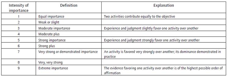 For those interviews, we explained to the representatives of the stakeholders that the comparison between two elements "need[s] a scale of numbers that indicates how many times more important or dominant one element is over another element with respect to the criterion or property with respect to which they are compared" (Saaty, 2008, p. 85). Table 4 shows Saaty's intensity of importance scale.