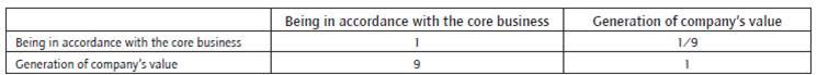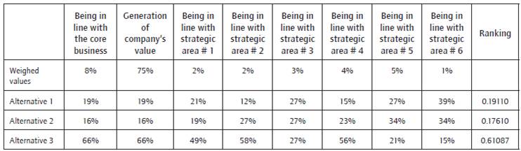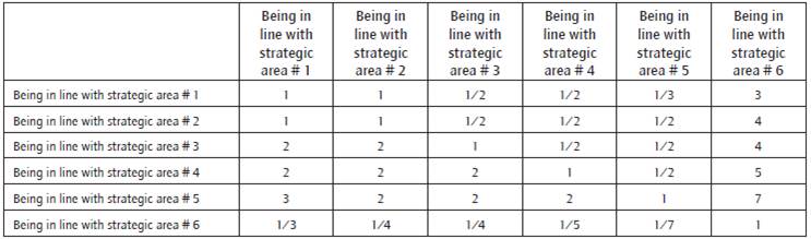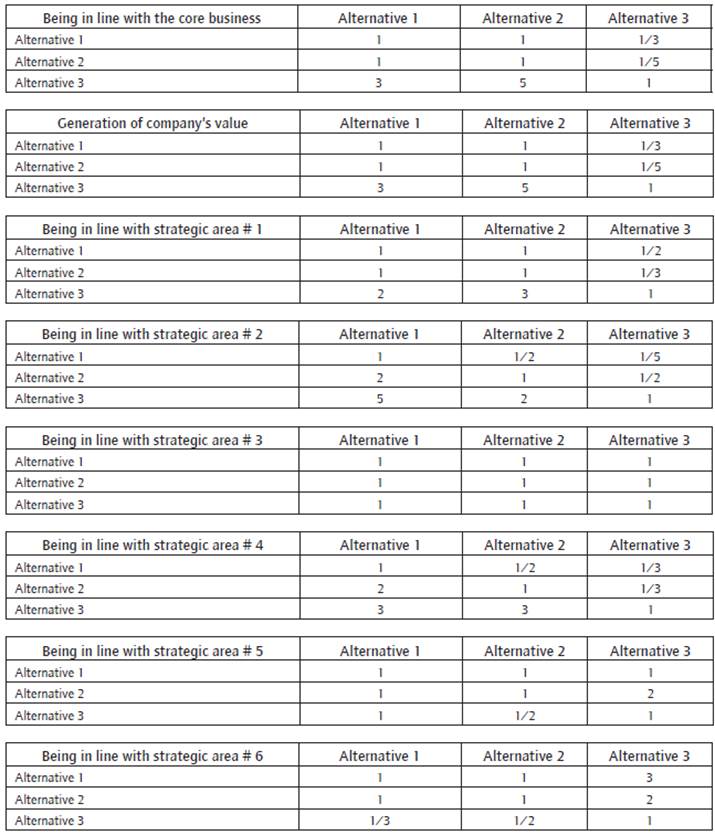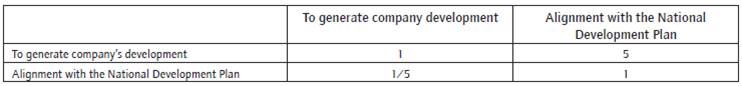In this case, we present eleven matrices to compare each element (see appendix 2). The first matrix compares the two main criteria; the second associates the sub-criteria of achieving the company's development; and the third compares the sub-criteria of contributing with the NDP. The other eight matrices are the combination of the different sub-criteria with each of the alternatives identified in the base of the tree. "Each element in an upper level is used to compare the elements in the level immediately below with respect to it" (Saaty, 2008, p. 85).