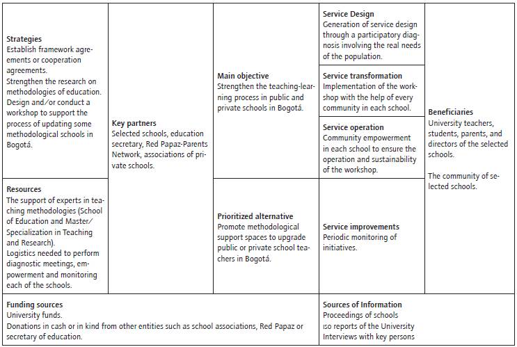 The prioritized alternative was to promote methodological support spaces to upgrade the skills of public or private school teachers in Bogotá, taking advantage of the experience of the university in this area. As part of the strategy, RedH's canvas allows to understand that it is necessary to establish framework agreements with private schools associations and the district secretary of education to establish a direct communication channel with schools. Likewise, to achieve the main objective, the University must strengthen the study on education methodologies, making use of the knowledge generated by its research groups in education sciences. Finally, once these conditions are met, it is necessary to design and conduct a workshop in the selected schools to support the process of teachers updating. It is important to highlight that the University must implement a monitoring and evaluation system before, during, and after the workshop to measure the impact of its intervention. In this way, this paper reveals that Sergio Arboleda University can contribute to the achievement of human development objectives in the city by implementing a set of practices within a strategy, based on its capabilities, and taking into account the needs of Bogotá.