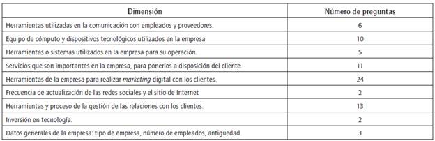 Las dimensiones presentadas en la tabla 1 tienen como objetivo analizar los medios utilizados para la comunicación con los empleados y proveedores para, de esta manera, conocer la tecnología empleada al interior de la empresa, así como los canales digitales en la comunicación con los consumidores. Asimismo, sirven para identificar los elementos de servicio al cliente que estos negocios consideran importantes ofrecer, conjuntamente con la forma en que implementan la gestión de relaciones con los clientes, y si existen organizaciones que destinen un presupuesto para la inversión en tecnología.