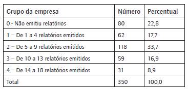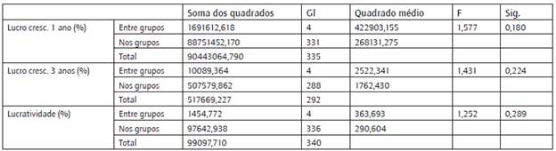 Quanto à média de percentual (tabela 1) nas três variáveis de lucratividade -Lucratividade (%), Lucro cresc. 1 ano (%) e Lucro cresc. 3 anos (%) - distribuída nos grupos, demonstrou que as empresas que apresentaram um maior percentual de lucratividade (15,82%) foram as que emitiram de um a quatro relatórios emitidos de sustentabilidade e as que tiveram menor percentual (11,53%) são aquelas que não emitiram relatórios.