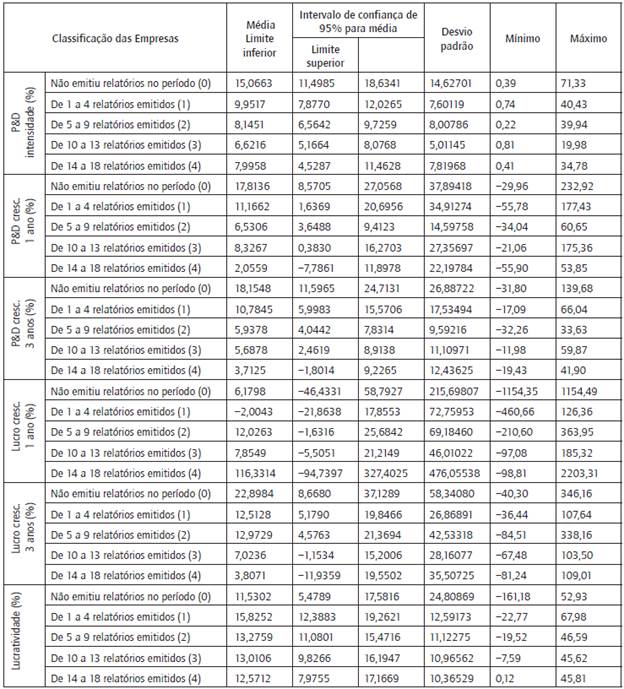 A tabela 1 apresenta a média do percentual das três variáveis relativas aos investimentos em P&D - P&D intensidade (%), P&D cresc. 1 ano (%) e P&D cresc. 3 anos (%) - conforme a distribuição nos grupos. Verificou-se que as empresas que apresentaram uma maior média (15,06%) de intensidade P&D foram as que não emitiram relatórios de sustentabilidade e as que apresentaram a menor média (6,62%) foram as que emitiram de dez a treze relatórios de sustentabilidade.
