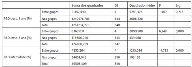 Tabela 3: Relação de investimento em P&D com o número de relatórios elaborados pelas empresas (ANOVA)