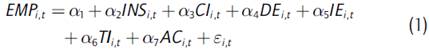 La ecuación 1 presenta la estructura de un modelo econométrico de emprendimiento para datos de panel, en donde, EMP es el emprendimiento por oportunidad, INS señala el factor institucional, CI representa el crecimiento del ingreso, DE es el desempleo, IE simboliza una variable de inestabilidad económica, TI especifica la tasa de interés, AC representa la apertura comercial, mientras que i y t simbolizan el país y el año, respectivamente.