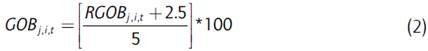 En la ecuación 2, GOB es el nuevo valor entre 0 y 1 para el indicador j del país i en el tiempo t; RGOB es el valor original entre -2,5 y 2,5 para el indicador j del país i en el tiempo t. Por ejemplo, si un indicador toma un valor de -1,5 en su rango original, para este trabajo representaría un 20% de desempeño eficiente en el indicador.