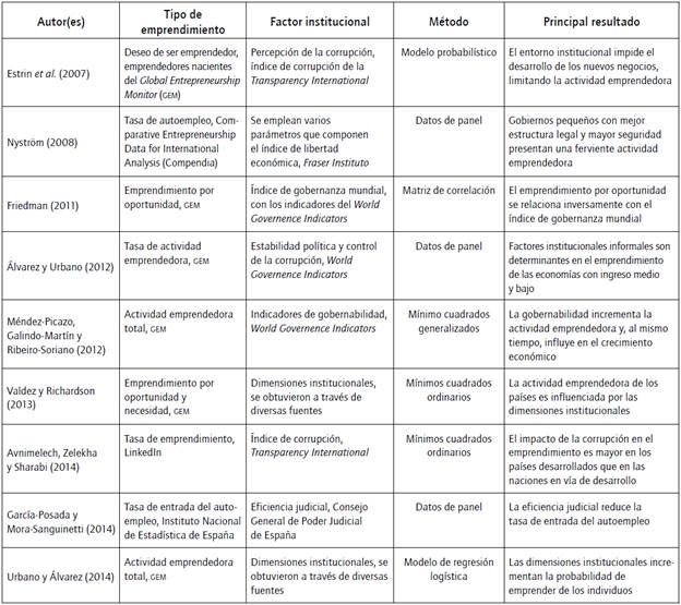 Existen investigaciones empíricas sobre la relación emprendimiento-instituciones (tabla 1). Estrin, Aidis y Mickiewicz (2007) analizan la influencia institucional en el emprendimiento por medio de una perspectiva comparativa, y concluyen que la escasa actividad emprendedora es consecuencia del entorno institucional, en el que los negocios establecidos son más favorecidos por las normas y leyes, en comparación con los entrantes.