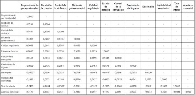 Finalmente, el índice de eficiencia gubernamental (IEG) se incorpora debido a los problemas de multicolinealidad que exhiben los indicadores de gobernabilidad, que se encuentran fuertemente correlacionados, impidiendo realizar una estimación conjunta de los indicadores (tabla 2). En otras palabras, este índice es la solución al conflicto de multicolinealidad y permite llevar a cabo una estimación confiable de estos indicadores. De esta forma, a través del IEG es posible apreciar el impacto conjunto de los indicadores en el emprendimiento por oportunidad de los países de América Latina y el Caribe. El cálculo del IEG consiste en el promedio de los indicadores de gobernabilidad.