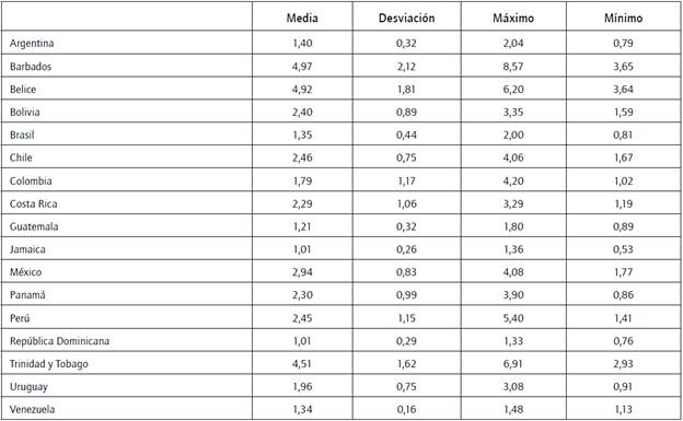 La tabla 3 muestra los estadísticos de emprendimiento, como el promedio, la desviación estándar, el valor máximo y mínimo, para cada uno de los países de estudio. Barbados es el país que reporta la media más alta en la razón emprendimiento oportunidad/necesidad, seguido de Belice, que presenta la mayor razón de emprendimiento oportunidad/necesidad entre los países latinoamericanos; sin embargo, estos dos países también presentaron la mayor dispersión. Por otra parte, las naciones con el menor promedio en la razón oportunidad/necesidad son Jamaica, República Dominicana y Guatemala, con 1,01, 1,01 y 1,20, respectivamente; curiosamente, estos países aparecen junto con Argentina y Venezuela dentro de las cinco naciones con las menores desviaciones.