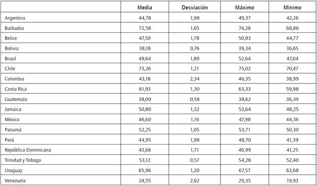 Con respecto a los valores máximos del IEG (tabla 4), aparecen Chile, Barbados, Uruguay y Costa Rica con cifras superiores al 60. Contrariamente, Venezuela, Guatemala y Bolivia muestran los promedios del IEG más bajos del grupo, pero también presentan los datos más pequeños en la columna de máximos. Entretanto, las naciones con los valores más bajos en el estadístico de mínimos son Venezuela, Guatemala, Bolivia y Colombia, mientras los mayores valores en el estadístico de los mínimos corresponden a Chile, Barbados y Uruguay. En general, Chile y Barbados se presentan como las dos naciones con los mejores IEG en América Latina y el Caribe, mientras que Venezuela presentó un bajo IEG, a tal grado que ni el máximo IEG de Venezuela (29,35) durante el periodo 2005-2016 es capaz de superar al IEG más pequeño (36,65 de Bolivia) entre el resto de los demás países.