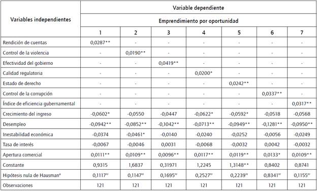 En la primera estimación de la tabla 5 aparece rendición de cuentas, como variable proxy institucional, en la función de emprendimiento por oportunidad. Esta variable institucional se relaciona positivamente con la actividad emprendedora, pues presenta un coeficiente de 0,0287 y estadísticamente significativo, de tal forma que una unidad en el indicador rendición de cuentas incrementará el emprendimiento por oportunidad en 0,0287%. En esta misma estimación, se destacan las variables explicativas de crecimiento del ingreso, desempleo y apertura comercial, pues resultaron ser estadísticamente relevantes para el emprendimiento; sin embargo, crecimiento del ingreso presenta una relación contraria a la esperada.