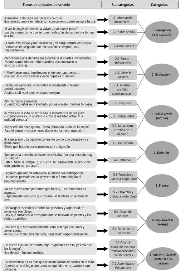 Identificamos siete categorías modulares, aspectos fundamentales del proceso de pensamiento en la experiencia de TD en los directivos entrevistados: 1) percepción de la situación, 2) evaluación, 3) juicio previo (motivo), 4) decisión (juicio resolutorio), 5) planeación, 6) implementación (elección), 7) análisis/vivencia posterior a la decisión.