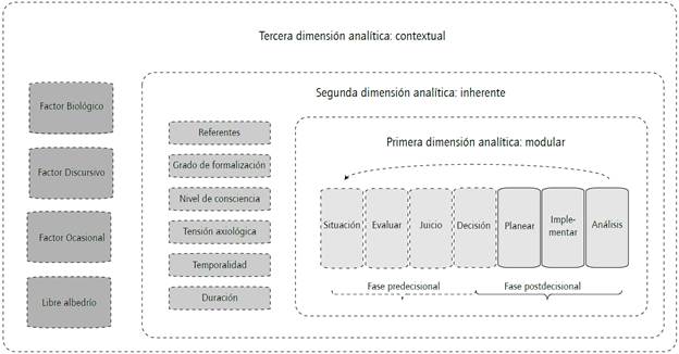 En la figura 3, se integran las tres clases de categorías que dan origen a tres dimensiones analíticas ordenadas según dos fases: predecisional y posdecisional, que tienden a ser cada una respectivamente no consciente (indicada por línea punteada) y consciente (indicada por línea continua). Los elementos ubicados hacia la izquierda del proceso de pensamiento decisorio tienden a ser implícitos y automáticos, mientras que los de la derecha tienden a ser conscientes y controlados. La expresión "tienden a ser" indica una gradualidad, un continuo que va desde una forma de pensamiento no consciente y automática, hasta una forma de pensamiento consciente y controlada. Hay mayor influencia en las decisiones, de los aspectos no conscientes. El esquema es flexible porque el proceso decisorio, fenomenológicamente, es gradual, continuo y se retroalimenta, es decir, no está dado de una vez y para siempre, sino que sus componentes se interrelacionan y el proceso se modifica a medida que va ocurriendo.