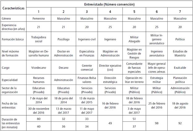 Entrevistamos siete directivos colombianos, con más de 10 años de experiencia en empresas de diferentes sectores. Determinamos el número de participantes por el criterio de saturación de la información (Sandoval, 1997). Conformamos la muestra mediante muestreo por conveniencia (Baron, 2008). Seleccionamos los participantes por su disposición a participar voluntariamente y sin contraprestación, según se aclara en el consentimiento informado, y los invitamos personal o telefónicamente. Realizamos cada entrevista en su lugar de trabajo o, cuando el entrevistado lo consideró preferible, en otro lugar. Como se desempeñan en campos de actuación diferentes, buscamos los elementos comunes al proceso de TD. En la tabla 1 presentamos características generales de los entrevistados, fecha y duración de las entrevistas.