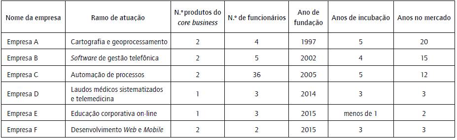 As empresas escolhidas para responder ao questionário do estudo foram aquelas que passaram por todo o período de incubação (graduadas), ou seja, o foco da pesquisa esteve nas organizações que já possuíam um produto disponível para o mercado e que obtiveram toda a infraestrutura e apoio da mesma incubadora, desde a fase de concepção da ideia até o produto colocado no mercado. Nesse caso, as empresas possuíam características distintas, porém todas trabalhavam com produtos de base tecnológica, por exemplo, atuações no desenvolvimento de automação na área de relógios de ponto e equipamentos para registro de ponto eletrônico, também no desenvolvimento de softwares corporativos e aplicações na Web, elaboração de documentos cartográficos através de CPS e imagens de satélites, além de softwares de geoprocessamento, dentre outros.
