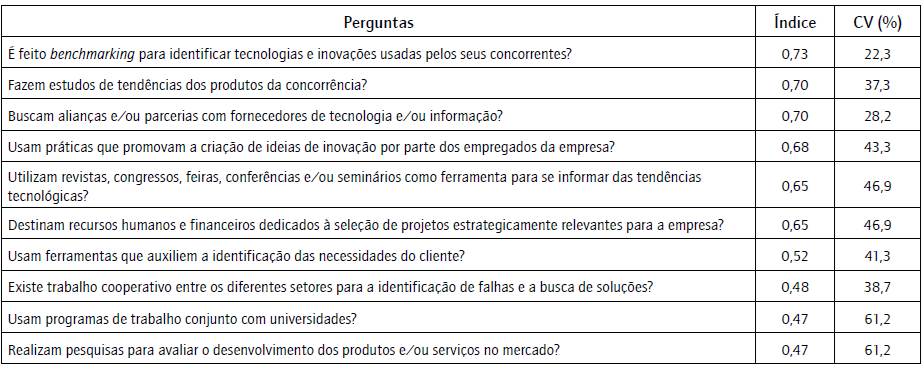 Por outro lado, entre os fatores estudados da etapa "buscar", que apresentaram menores índices, está o trabalho em parceria com universidades, entendido como um dos mecanismos comumente usados pelas EBTS para adquirir novos conhecimentos, sendo que as empresas manifestaram que essa relação está limitada à celebração de convênios com faculdades através de programas de estágio. Essas empresas, após se graduarem, diminuíram a frequência na realização de atividades de controle estratégico rotineiras durante o período de incubação, como o caso das auditorias internas, das reuniões para o monitoramento e desenvolvimento de indicadores entre colaboradores e diretores. Embora o índice não seja inferior a 30%, o coeficiente de variação supera os 50%, o que indica que nem todas as empresas consideram esses fatores como primordiais para o desenvolvimento dos processos de inovação. O baixo índice referente ao fator de trabalho conjunto entre áreas multidisciplinares permitiu identificar a ausência de atividades rotineiras que integrassem as áreas responsáveis pela execução dos projetos de inovação, especialmente daquelas que envolvem o controle, a identificação e a solução de falhas, técnicas e tecnológicas que demandam sinergia organizacional. Soma-se também a isso a ausência de documentos, registros e indicadores que permitam fiscalizar a evolução temporal e o desenvolvimento econômico dos projetos de inovação.