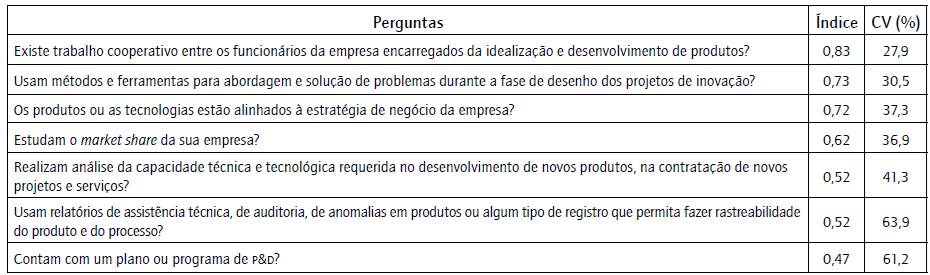 Ainda nesta etapa, foram identificados índices que apresentaram baixa avaliação (i<0.5) e que correspondem ao uso de rotinas e/ou procedimentos padronizados para P&D ao interior das EBTS. Nesse caso, as empresas não contam com planos estrategicamente desenhados; não existem horizontes nem planos de investimento claramente definidos, o que implica pouca flexibilidade da empresa para facilitar inovações de caráter incremental. Essas empresas promovem a prática de canais de comunicação aberta e editais para a submissão de propostas por parte dos colaboradores, a fim de capturar novas ideias, fato que permite criar uma dinâmica participativa nos processos de inovação; contudo, essas práticas são carentes de mecanismos de incentivo e programas de promoção interna contínuos, além da ausência de planos de formação técnica dos colaboradores.