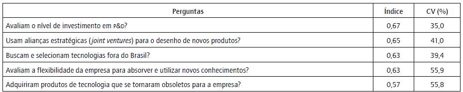 De acordo com a Tabela 5, é possível evidenciar, na etapa "implementar-adquirir", que as empresas demonstraram maior preocupação quanto aos investimentos em P&D. Assim, as EBTS argumentaram que esses investimentos são feitos paulatinamente na aquisição de novas tecnologias (hardware, software), na adaptação de processos a essas novas tecnologias, na contratação de mão de obra e na capacitação técnica, situação que, na maioria das vezes, decorre da obsolescência de algumas tecnologias e que demanda aquisições imediatistas como consequência da contratação de novos projetos. Nesse caso, o índice não foi elevado (i<0.7), mas demonstra o esforço das EBTS na destinação de recursos financeiros para alavancar processos de inovação. Adicionalmente, as empresas asseguram contornar a ausência de conhecimento técnico usando de joint venture, especialmente na etapa de design de novos produtos.